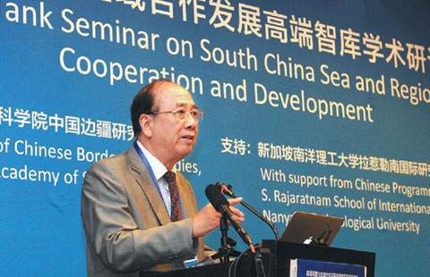 Zhao Qizheng, former minister of China's State Council Information Office, delivers a keynote speech at the Think Tank Seminar on South China Sea and Regional Cooperation and Development held on Monday in Singapore.