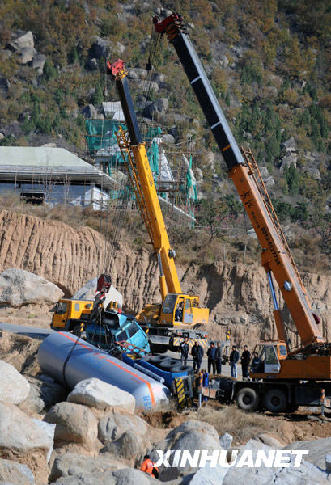 10月30日14點(diǎn),一輛載有20多噸液化氣的運(yùn)輸罐車,從遼寧盤錦駛往河北省三河市,因走錯(cuò)路來到了天津薊縣,在津薊高速路盤山出口處轉(zhuǎn)彎時(shí)發(fā)生事故,導(dǎo)致罐車側(cè)翻,液化氣泄漏,隨時(shí)有發(fā)生爆炸的危險(xiǎn)。薊縣消防大隊(duì)的官兵在第一時(shí)間趕到現(xiàn)場,在相關(guān)部門的配合下,經(jīng)過70多個(gè)小時(shí)的奮戰(zhàn),終于將液化氣罐車事故險(xiǎn)情徹底排除。目前事故的罐車已拖離現(xiàn)場。新華社發(fā)(費(fèi)洪杰攝)