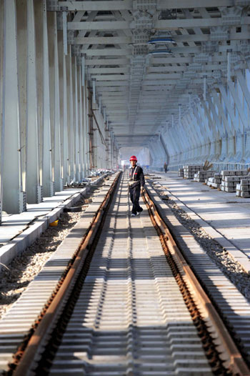 全線鋪通的武漢天興洲公鐵兩用長江大橋首條貨運鐵路線(2月10日攝)。2月9日,武漢天興洲公鐵兩用長江大橋首條貨運鐵路線全線鋪通,為大橋2009年6月底通車奠定了堅實基礎(chǔ)。天興洲大橋共有4條鐵路線,首條貨運鐵路線鋪通后,火車可從江南或江北引橋運載施工物資、設(shè)備上正橋,這將使剩余3條鐵路線的鋪設(shè)速度大幅提高。(新華社記者 杜華舉 攝)