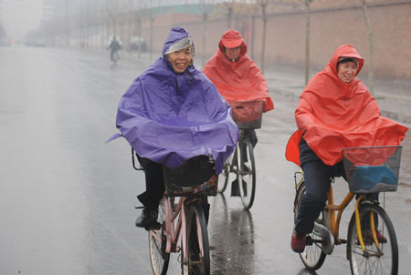2月12日,幾位市民在石家莊街頭冒雨騎行。 當日,河北省中南部地區出現降雨,雨量為2-4毫米,局部地區雨量達到5毫米。 新華社記者 楊世堯攝
