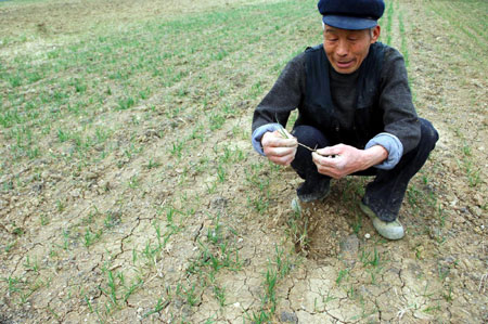 2月12日,安徽省宿州市百善鎮農民黃文章查看生長不良的麥苗。 從當日開始,我國大部分旱區陸續迎來降雨。但安徽省氣象部門負責人表示,由于這一輪降雨量較小,安徽北部地區的干旱仍將持續。新華社記者 李健攝