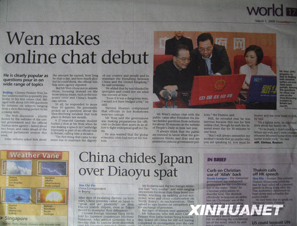 這是3月1日新加坡《海峽時報》對溫家寶總理與網民線上交流的報道。新華社記者 張永興攝