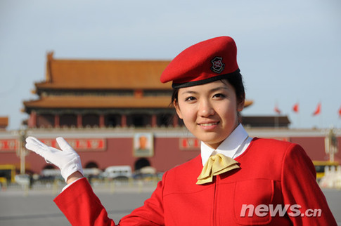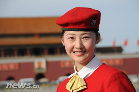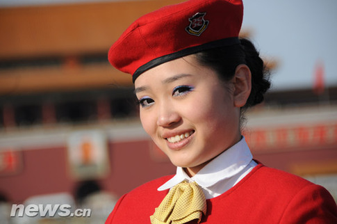 3月9日,北京會議中心一位服務兩會的禮儀小姐在天安門廣場留影。新華網 文濤攝