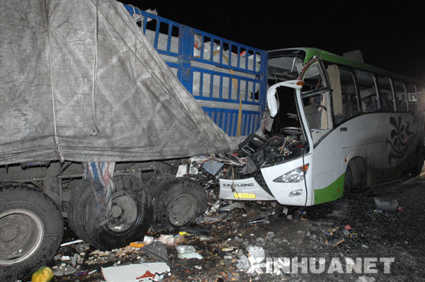記者19日20時40分趕到事故現(xiàn)場時,客車內(nèi)被困人員已經(jīng)被救出送往醫(yī)院。記者在現(xiàn)場看到,一輛車號為黑L49970的客車右前部與一輛車號為黑D29033的貨車左后部相撞。客車受損嚴(yán)重,車身已經(jīng)被破拆,車廂右側(cè)基本已大部分敞開,部分座椅已被拆除扔到道路一旁,車內(nèi)物品連同破碎玻璃散落一地。記者還在現(xiàn)場看到了一輛小轎車和另一輛翻在路邊溝中的貨車,均已不同程度受損,公路右側(cè)的護欄也被撞倒。