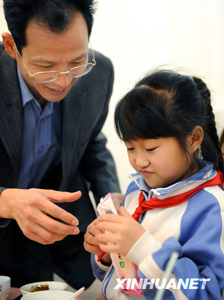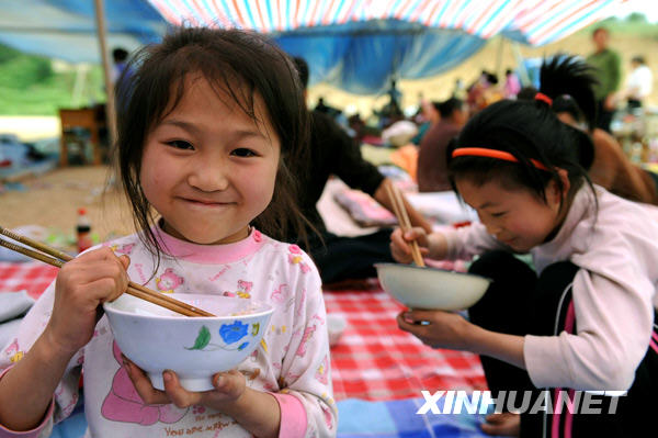 這是2008年5月13日,在陜西省寧強(qiáng)縣青木川鎮(zhèn)輔仁中學(xué)避震點(diǎn),魏玉潔在吃午餐。新華社記者 陶明攝