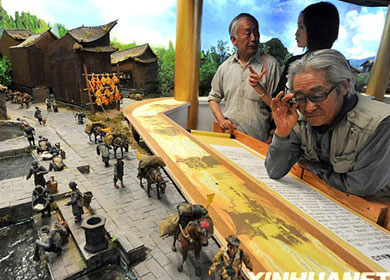 6月16日,一名學者(右一)在仔細端詳微縮“馬幫隊”。當日,云南省麗江市馬幫路民族文化藝術館開館,并向參觀者免費開放。藝術館展出的長達200米的茶馬古道全景具象立體微縮模型,由當地藝術家和青年工匠耗時3年全手工完成。模型景觀中,由1700多名人物、200多棟建筑、500多匹騾馬和其它動植物組合成的生活圖景逼真動人、栩栩如生,全方位展示了昔日趕馬人跋山涉水,從云南驅馬馱運茶鹽等物資送抵西藏的艱辛歷程及沿途風土人情。新華社記者陳海寧攝