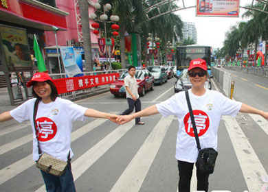 2009年6月20日上午,在深圳華強路與振興路口,一群身穿前后印有“停”或“行”字白色T恤的勸導人員,隨著紅綠燈的變化組成人體警示線。