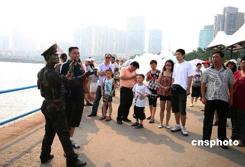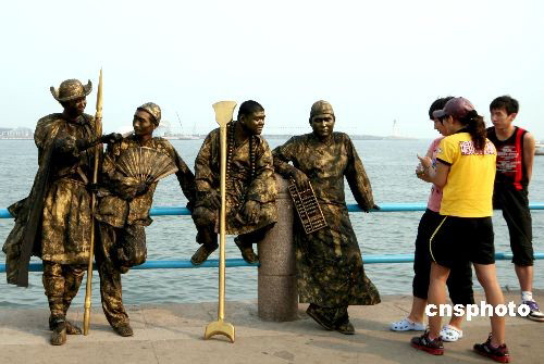 7月初,山東青島市五四廣場上的真人雕塑吸引游客“眼球”。這些古銅色的真人雕塑有的打扮現代、有的古樸,倚靠在廣場的欄桿上,不斷變換著姿勢與表情。由于他們從頭到腳被噴上了古銅色油彩,其膚色獨特,打扮各異,吸引了大批游客的目光。中新社發 胡衛國 攝