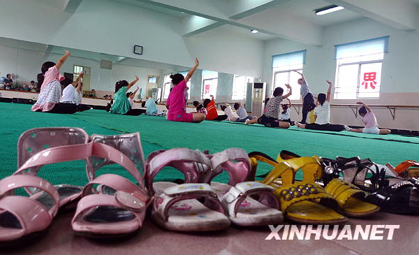 7月8日,在江蘇省大豐市大中鎮,孩子們在舞蹈教室內學習舞蹈基本功。新華社發(周古凱 攝)