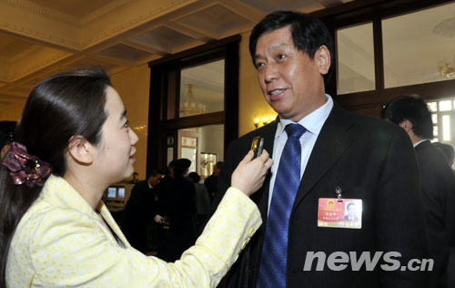 3月5日,十一屆全國人大二次會議在人民大會堂開幕。圖為全國人大代表栗戰書接受新華網記者的采訪。陳濤 攝