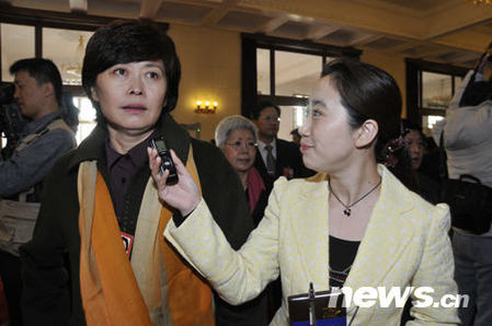 2009年3月5日,十一屆全國人大二次會議在北京人民大會堂開幕。圖為全國人大代表敬一丹接受新華網(wǎng)、中國政府網(wǎng)記者采訪。她說:“我有一些關(guān)于環(huán)境保護的建議。同時我作為一名電視人,我的欄目也關(guān)注就業(yè)、農(nóng)民工和醫(yī)保問題。”陳濤攝