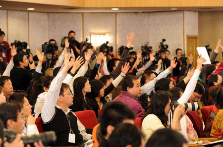 3月10日,十一屆全國人大二次會議舉行記者會,工業和信息化部部長李毅中、人力資源和社會保障部部長尹蔚民、商務部部長陳德銘答記者問。這是記者舉手提問。 新華社記者 章磊攝