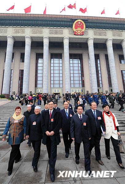 這是全國政協委員走出北京人民大會堂。新華社記者陳樹根攝