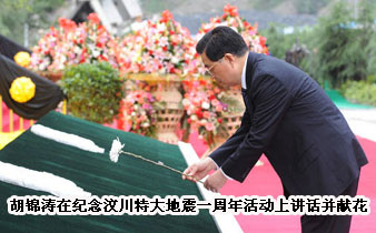胡錦濤在紀念汶川特大地震一周年活動上講話并獻花 |