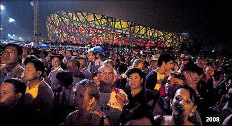 我們不妨來通過王文瀾先生拍攝的這張彩色照片看一下中國的體育產業,照片上是北京奧運會的標志性場館——國家體育館,俗稱“鳥巢”。照片拍攝于2008年8月8日奧運會開幕式結束之后,在趕著回家的人潮背后,這座價值32億元的體育館靜靜地矗立著,燈火通明、美麗絢爛。
