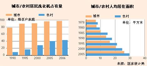 不過,說到空間還得用面積來衡量。過去的30年中,中國城市居民的人均居住面積擴大了近4倍,而且每家每戶都買得起洗衣機也意味著他們有更多的空間來放置大件和其他物品了。