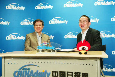 2009年3月10日上午,中國日報網特邀全國政協委員、中國(海南)改革發展研究院院長,多次應邀進中南海被中國高層問策的知名專家遲福林做客直播間,圖為遲福林(左)接受中國日報記者付敬(右)專訪。